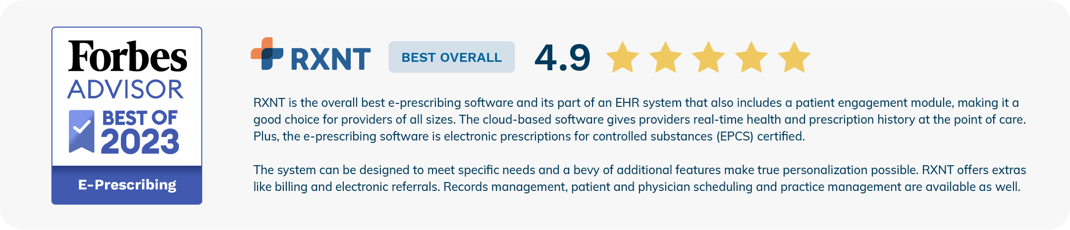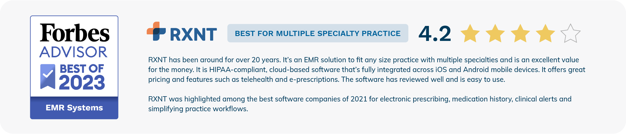 Looking for a trusted software system to support your medical practice or healthcare business? Forbes Advisor named RXNT Best Overall E-Prescribing and Best EMR for Multi-Speciality Practices in 2023 thanks to our affordable, customizable suite of healthcare software that's trusted by thousands of physicians nationwide.